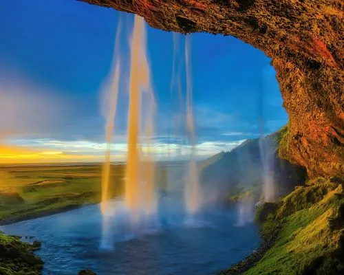 El segundo día te llevará a explorar la espectacular costa sur de Islandia. Desde Reykjavik, emprenderás el viaje hacia la Cascada Seljalandsfoss, una impresionante cascada que cae desde una altura de 60 metros. ¿Sabías que tendrás la oportunidad de caminar detrás de la cascada y disfrutar de una vista única?